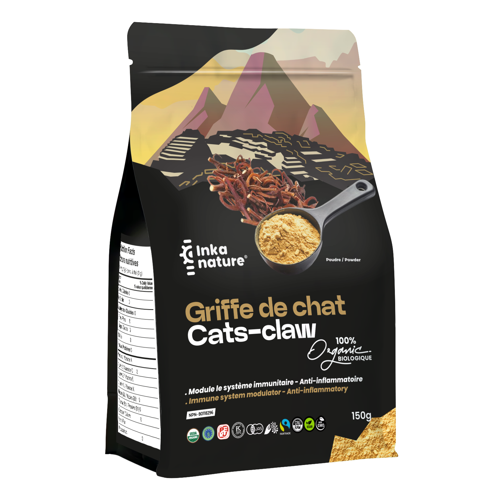 La Griffe de Chat (Uncaria tomentosa) est une grande vigne ligneuse originaire de l’Amazonie est couramment la plus utilisée en médicine traditionnelle, particulièrement traiter l’asthme, les inflammations des voies urinaires, l’arthrite, les rhumatismes et les douleurs osseuses, pour se remettre d’un accouchement, comme nettoyant rénal, pour soigner les blessures profondes, pour contrôler l’inflammation et les ulcères gastriques et pour le cancer. Nos plantes de Griffes de Chat sont cultivées en plein air selon les standards de la réglementation de l’Agriculture biologiques sans modifications génétiques, cueillies à la main, séchées et réduites en poudres par des fermiers de la région de St. Martin et de Junin au Pérou. Cette vigne extraordinaire regorge d’éléments photochimiques, alcaloïdes d’oxydes, antioxydants, stérols végétaux et esters alkyliques de caboxyles.