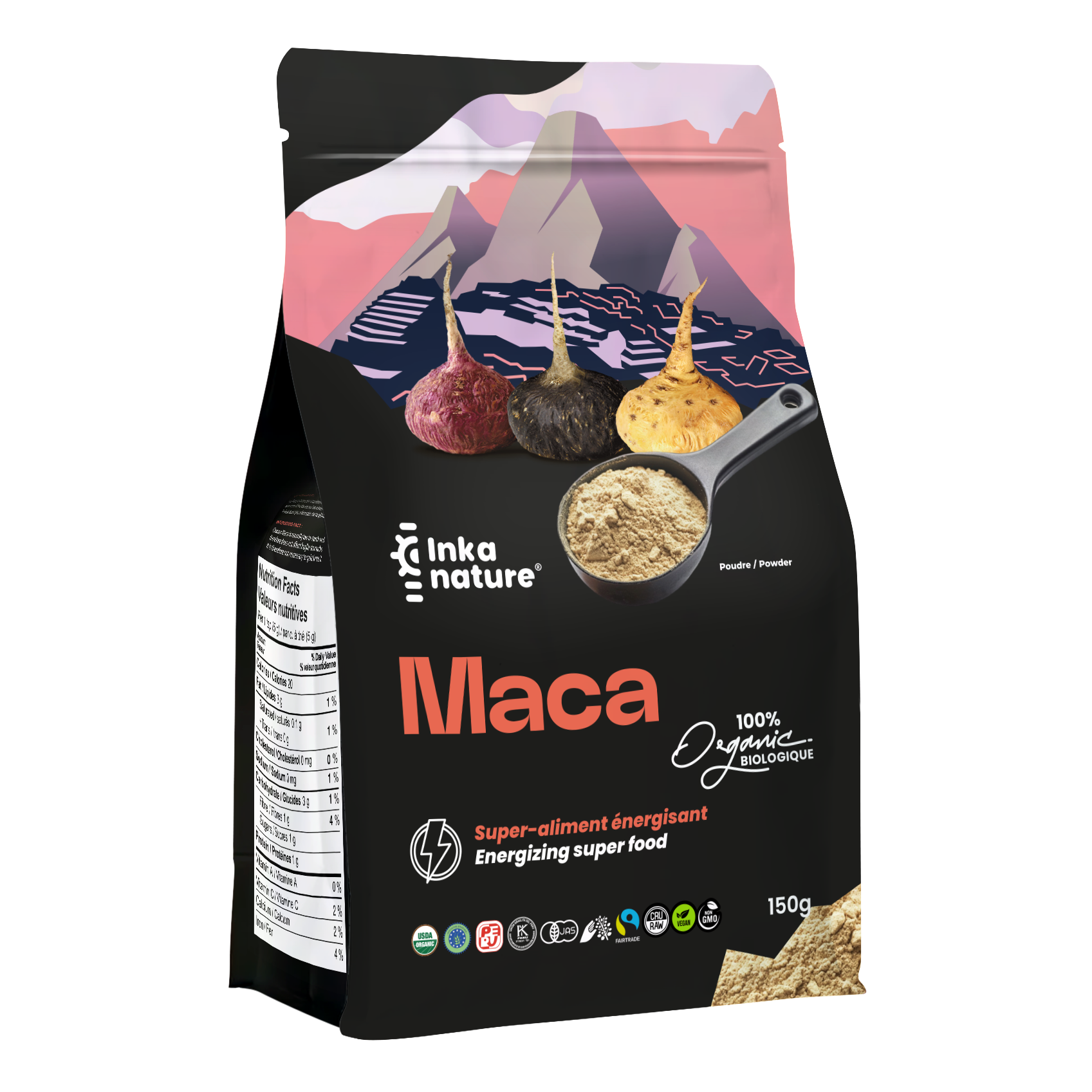 La Maca Chacon (Lepidium meyenii) est une plante originaire des hauts plateaux de la Cordillères des Andes à 3500m d’altitude et étaient utilisés par les Incas comme ressource alimentaires, puis pour ses vertus thérapeutiques et son pouvoir sur la sexualité et la fertilité. Nos plantes de Maca Chacon sont cultivées en plein air selon les standards de la réglementation de l’Agriculture biologiques sans modifications génétiques, cueillies à la main, séchées et réduites en poudres par des fermiers de la région de Junin au Pérou. La richesse des sédiments glaciaires des plateaux de Junin confère une fabuleuse concentration de 150 ingrédients actifs. Elle regorge de minéraux, d’oligo-éléments et d’acides aminés.
