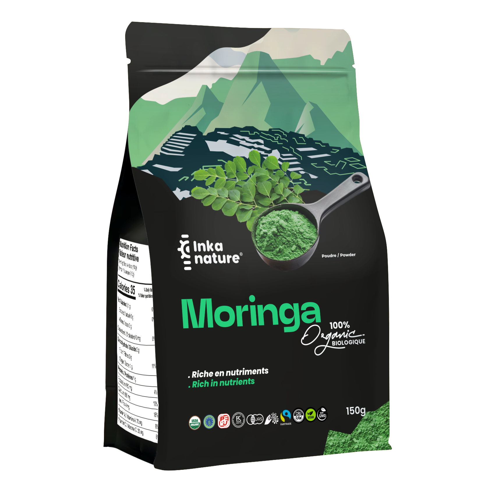 Le Moringa (Moringa oleifera) est un arbre originaire du nord-ouest de l'Inde et utilisés par de nombreux natifs de la zone où il croît dans leur cuisine pour induire la croissance et retarder les vieillissement des cellules. Nos plantes de Moringa viennent d’une famille Sénégalaise qui en font le commerce depuis 7 générations et sont cultivés en plein air selon les standards de la réglementation de l’Agriculture biologiques sans modifications génétiques, cueillies à la main, séchées et réduites en poudres par des fermiers Sénégalais. Le Moringa est une plante adaptogènes contenant 7 fois plus de Vitamine C que les oranges, 20 fois plus de Vitamine A que les carottes, 17 fois plus de calcium que le lait, 9 fois plus de protéines que le yaourt, 15 fois plus de potassium que les bananes et 20 fois plus de fer que les épinards.